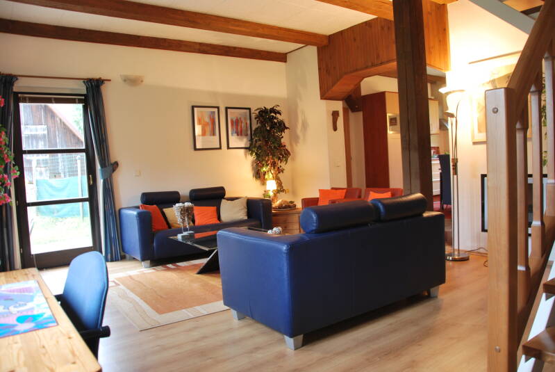 Woonkamer: zithoek, bureautje, tv met satellietontvanger, sfeerhaard