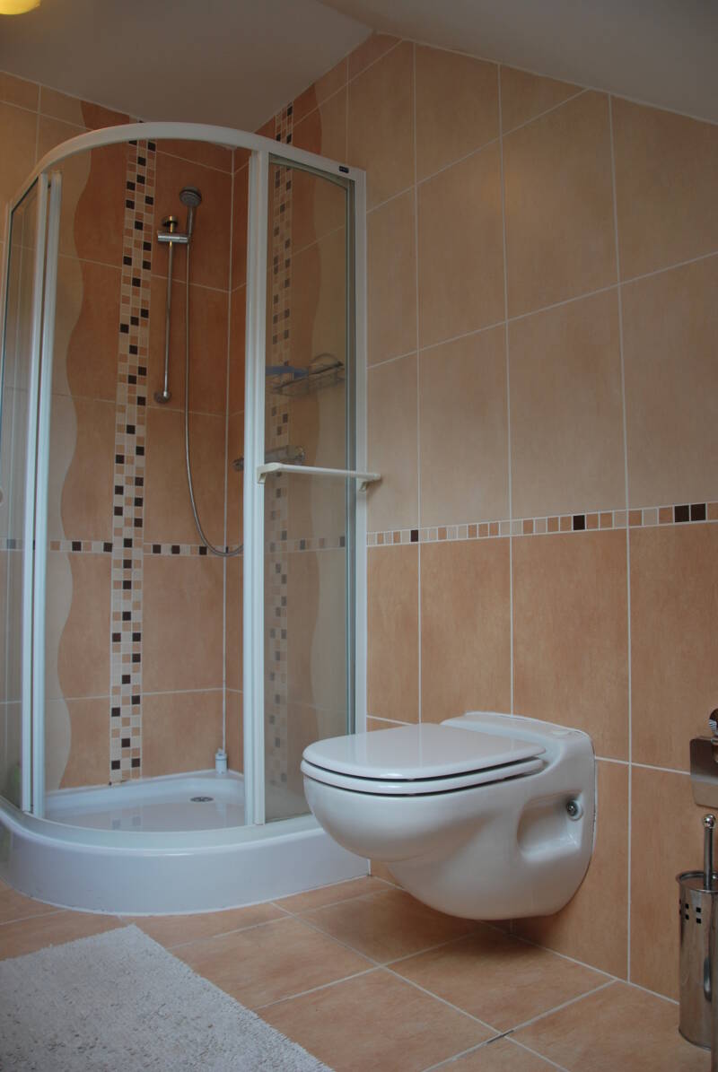 Badkamer: wastafel, douche, toilet, radiator/handdoekendroogrek