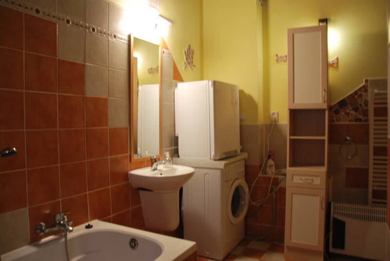 Badkamer: bad, douche, wasmachine, wasdroger, wastafel, droogrek