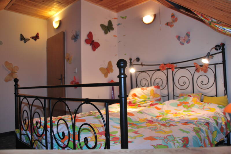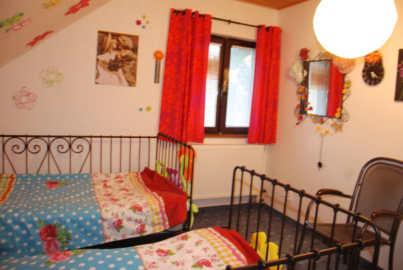 Slaapkamer 1: twee persoons bed, zitje, kinderbedje, linnenkast